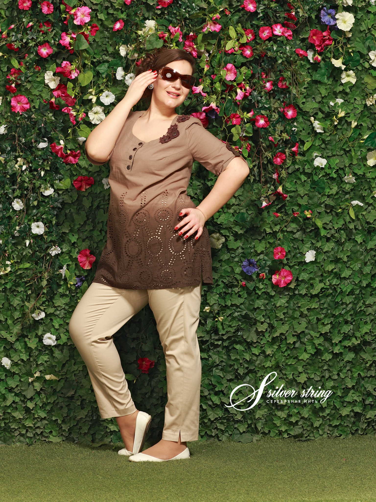Удлиненная блуза-туника с разрезами по бокам, с рукавом, прикрывающим локоть, выполнена из хлопчатобумажной ткани с вышивкой в технике " Решелье". Планка по горловине зрительно удлиняет силуэт. Особую актуальность изделию придает расцветка полотна: низ изде-лия имеет более интенсивную окраску, которая к верху переходит в пастельный оттенок.