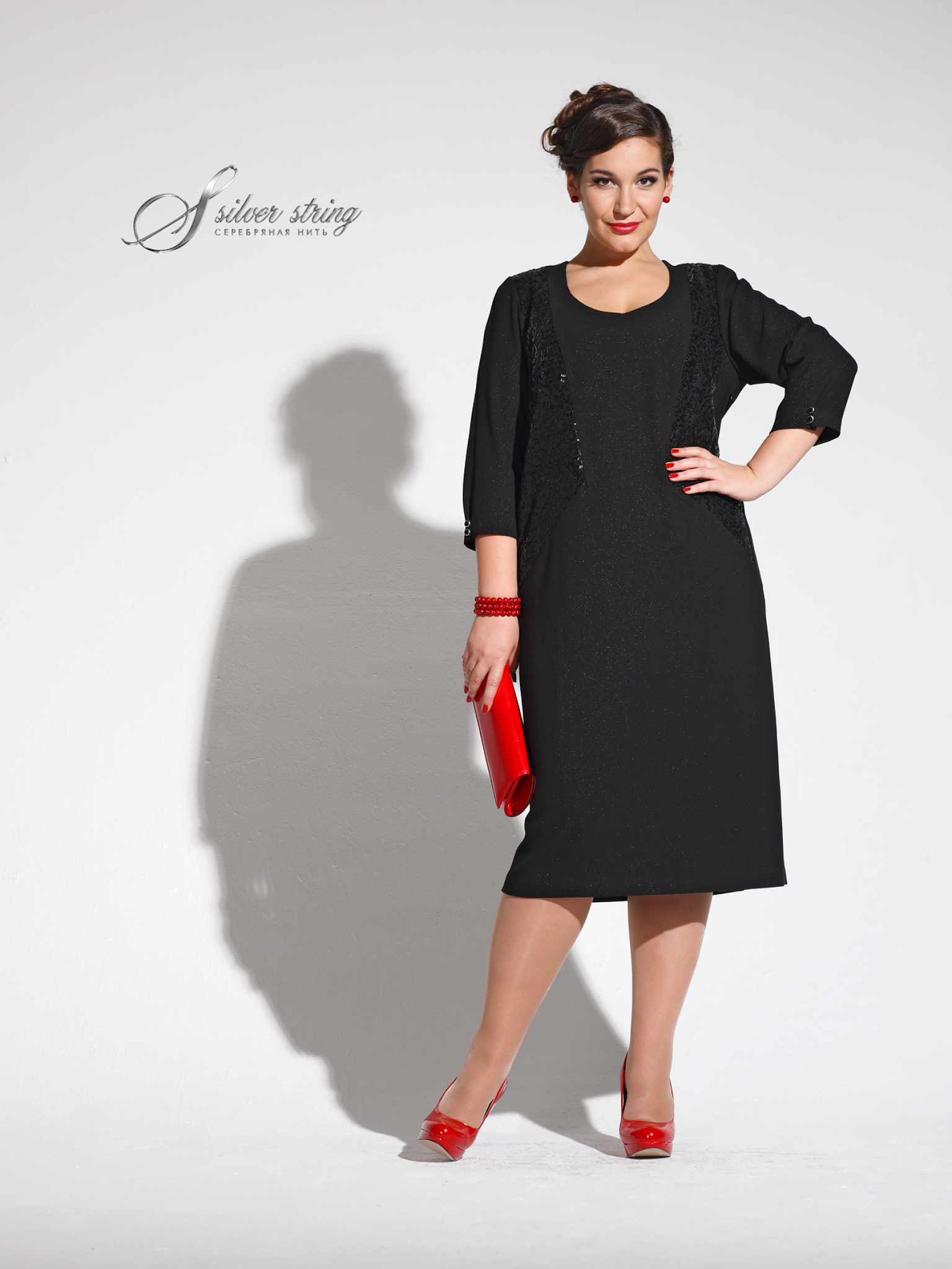 Платье прямое,немного приталенное. Черная эластичная ткань с небольшим блеском, по боковому шву вставлена ткань расшитая паетками. Рукав 3/4 с мягкой складкой,зафиксированной на две пуговицы.