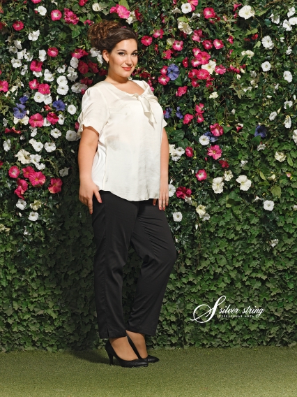 Нарядная блузка прямого силуэта. Рукав короткий с частично вставленной резинкой по линии низа. Горловина оформлена необычной по форме драпировкой. Полочка и рукава выполнены из шелка, спинка из трикотажа.