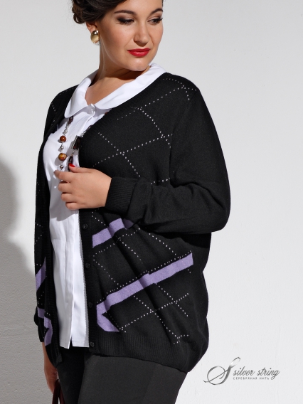 Прямой вязаный кардиган черного цвета, с ромбовидным рисунком, нежно- фиалетового цвета, на полочке. Рукав длинный. Застегивается на планку с пуговицами.