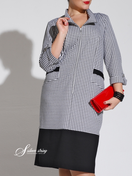 Платье футляр. Длина ниже колен, рукав 3/4, воротник на молнии, распашной. На спинке кулиска. Модель отшита из эластичного трикотажа. Рисунок основной ткани черно-белая "гусиная лапка", отделочная ткань черного цвета.