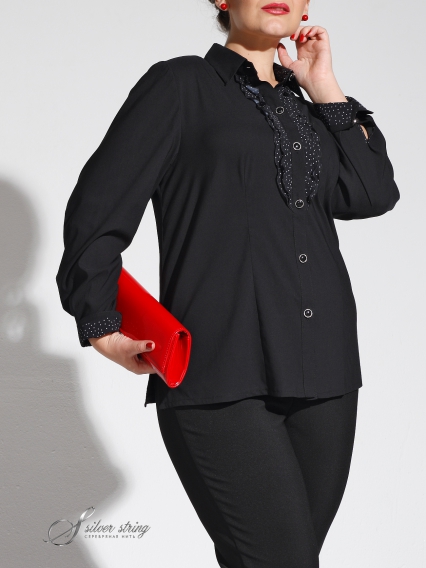 Блуза-батник полуприлегающего силуэта из эластичной ткани, с длинным рукавом. Использование разнофактурной ткани в отделке модели делает её современной и актуальной.