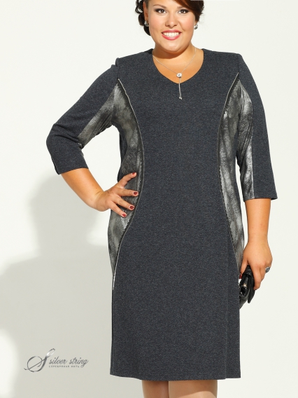 Платье "футляр". Черный трикотаж - джерси. Бока и часть рукава из отделочной ткани. По вертикальным рельефам настрочены фрагменты молнии. Рукав втачной, длина 3/4. Горловина "у" образная.