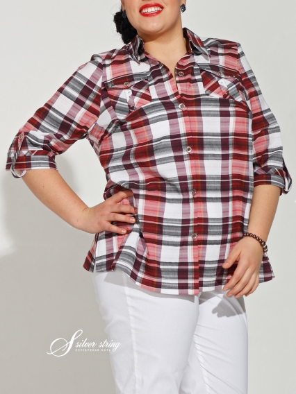Замечательная прямая блузка из ткани с большим содержанием хлопка. Наличие эластана (5%) создает особый комфорт движению. Рисунок в клетку отлично сочетается с декоративными элементами - карманы в области груди, спортивный воротник, рукав 3/4 на манжете, подхвачен патой. Осталось подобрать однотонные брюки, и комплект готов!