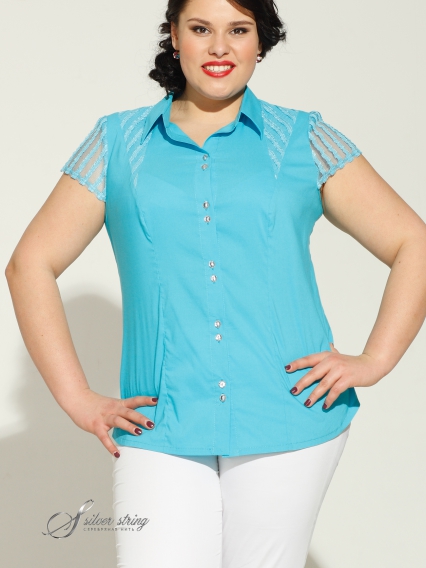 Милая летняя блуза полуприталенного силуэта для романтичных барышень. Нежно голубая ткань с высоким содержанием хлопка. При этом очень тонкая и эластичная. Рукав втачной очень короткий и треугольные вставочки на груди выполнены из гипюра того же цвета, что и основная ткань. Воротник отложной на стойке. По краю борта- пуговицы-стразы. Очень привлекательно.