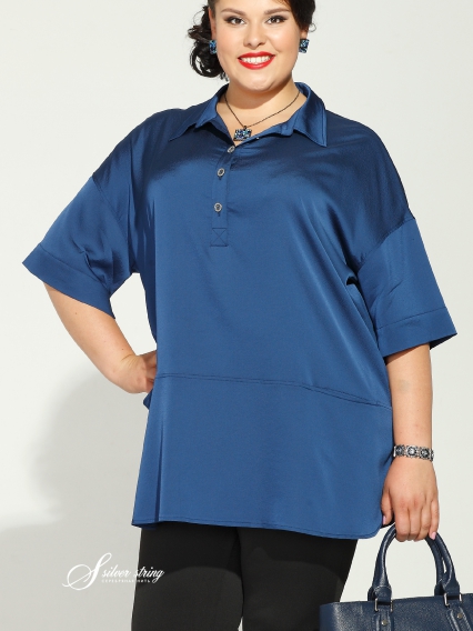 Великолепный блузон из тонкой шелковистой ткани с высоким содержанием вискозы. Выполнен в стиле "оверсайз". Рукав втачной 3/4 со спущенным плечом. На груди планка с застежкой - пуговицами. Воротник отлетной со стойки. На полочке - по линии бедер - подрез с прорезными кармашками. Скругленные боковые швы смотрятся как разрез.