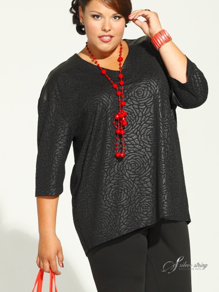 Туника короткая с разным уровнем по линии низа полочки и спинки в стиле "оверсайз". Использован однотонный " дышащий" трикотаж из вискозного волокна с эластаном. Круглый вырез горловины. Рукав свободный 3/4. На плечах - кокетки из тонкой искусственной кожи.