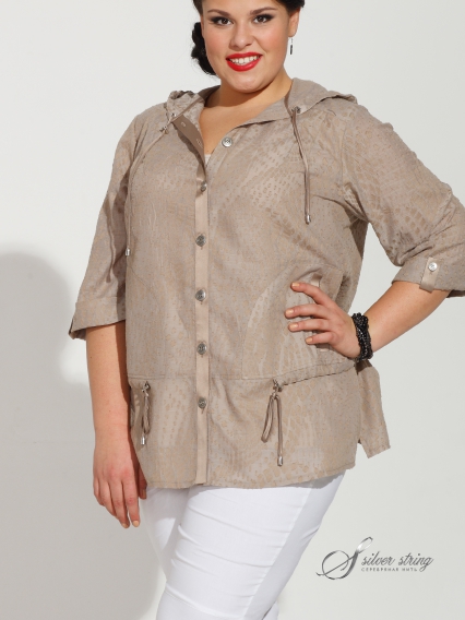Темно-бежевый блузон средней длины в свободном стиле с застежкой на пуговицах. По бедрам и краю капюшона - кулиска с атласным шнурочком. Втачной рукав с отворотом-манжетом, фиксируется патой с пуговицей. Планка и вход в накладной карман отделаны атласом в тон основного цвета изделия. Блузон выполнен из ткани с высоким содержанием хлопка, что обеспечит комфорт в носке и сможет послужить ветровкой в прохладный летний денек.