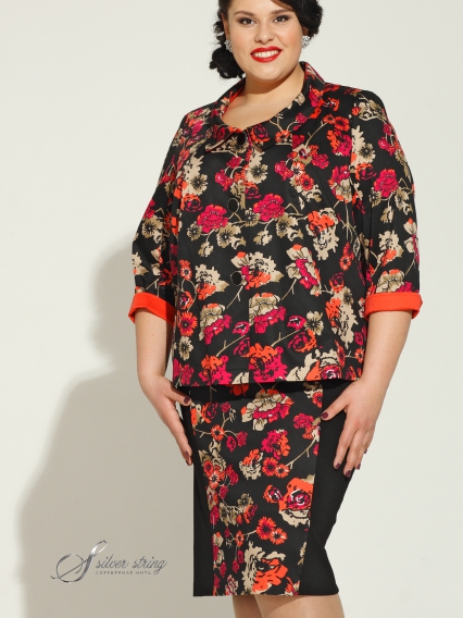 Летний , средней длины цветной жакет из хлопковой ткани с добавлением эластана. На спинке расположена кокетка, от нее до низа изделия бантовая складка внутри которой отделочная ткань. Отложной воротник, подборта и низ отгибающегося рукава обработаны однотонной тканью-компаньоном, что очень украшает эту вещь. Имеется еще один вариант жакета-из однотонной ткани с отделкой из цветного материала. Предлагаем скомпановать с юбкой No 2401161 для создания костюма.
