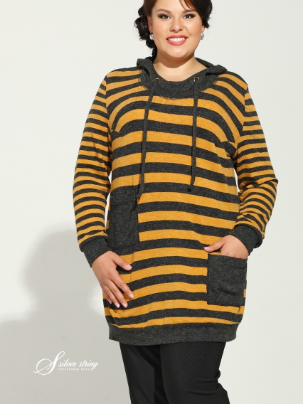 Удлиненная туника с длинным рукавом и с капюшоном. Манжеты, пояс модели, капюшон и карманы выполнены из однотонной отделочной ткани. Карманы на полочке расположены на разном уровне.