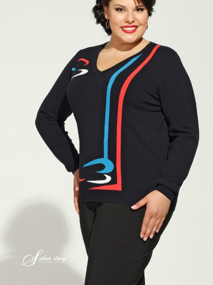 Темно-синий джемпер с ярким геометрическим узором по полочке. По низу изделия и рукава вязаная резинка высотой 5см.