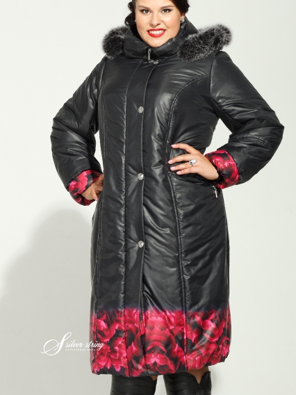 Пальто женское зимнее полуприлегающего силуэта длиной "за колено". Ткань верха плащевая, очень тонкая, легкая, влагоустойчивая. Подкладка изделия натуральная, вискозная, "дышащая". Для утепления данной модели был использован современный утеплитель "изософт", очень тонкий, легкий, но при этом удерживающий комфортную температуру тела. В помещении в нем не жарко, но выдерживает отрицательные температуры до - 25 С. Воротник-стойка, к которому пристегивается капюшон на молнии, обрамленный мехом песца. Застегивается пальто на молнию с двумя бегунками. Она прикрывается планкой с кнопками. Рукав втачной . На полочках прорезные карманы на молнии. Особо эффектно смотрится пальто за счет купонного рисунка ткани по низу изделия и низу рукава.