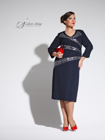 Нарядное платье полуприлегающего силуэта, с рукавом, длиной 3/4. Декоративные вставки, из оригинальной отделочной ткани, буквально пронзают полочку, завораживая своим мерцанием.