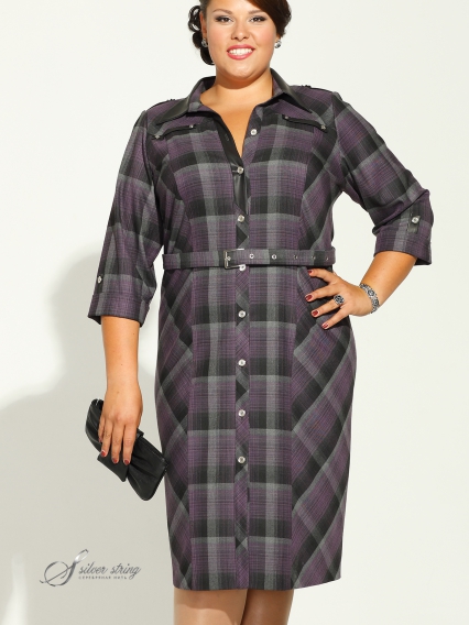 Клетчатое платье в стиле "сафари", длиной до середины икры, с рубашечным воротником и рукавом длиной 3/4. Воротник, паты рукавов, погоны, нагрудные клапана, фрагмент планки- выполнены из эко-кожи. Платье распашное до низа, с застежкой на пуговицы. Дополняет модель пояс из основной ткани с застежкой на пряжку.