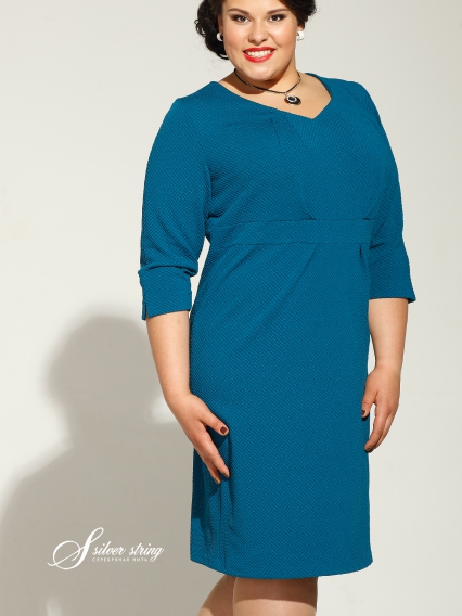 Красивое васильковое платье длиной " чуть за колено", полуприталенного силуэта. У- образный вырез горловины, рукав втачной, зауженный к низу с маленьким разрезом. На полочке поперечная вставка, имитирующая пояс, с двумя защипами, эффектно подчеркивает грудь.