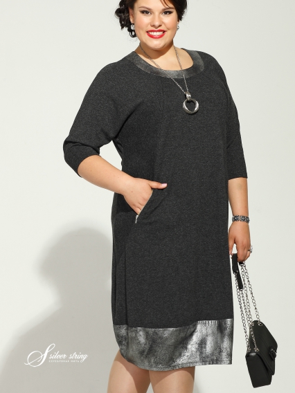 Платье длиной "чуть за колено" из хорошего мягкого вискозного трикотажа с шерстяным волокном. Рукав-реглан 3/4 , зауженный к низу. На полочке проходят рельефы, в которых расположены карманы с косым входом и застегиваются на молнию. Круглый вырез горловины оформлен обтачкой из трикотажа " под металл". Из него же выполнен и подрез по низу изделия, который формирует силуэт "баллон".