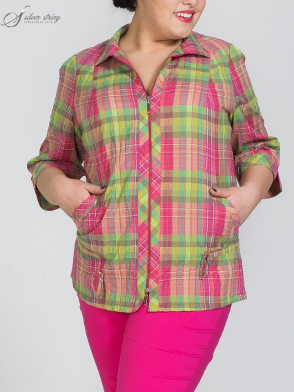 Блуза средней длины прямого силуэта из клетчатой эластичной крэш ткани с большим содержанием хлопка (80%) и вискозы(18%). Рукав втачной 3/4 на манжете с разрезиком. Спортивный отложной воротник. На спинке складочка для удобства движения. На плечах спереди и сзади расположены кокетки, выкроенные по косой. На уровне бедер по спинке и бокам проходит декоративная кулиска, в которую продернут шнурок из основной ткани, что позволяет формировать вещь на фигуре. Удобные прорезные карманы с листочками, выкроенными по косой. Так же оформлена планка для молнии, на которую по всей длине застегивается блуза.
