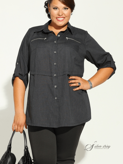 Блуза из хлопчатобумажной ткани, прямого силуэта, с рукавом, длиной 3/4 и рубашечным воротником. Нагрудные карманы отделаны металлическими молниями, на спинке обработана кокетка, по центру которой расположена легкая сборка. По полочке и спинке оформлена отлетная складка. Паты на рукавах позволяют регулировать длину