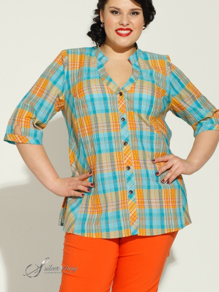 Блуза из клетчатой ткани с большим содержанием хлопка, средней длины, полуприлегающего силуэта. Красивый вырез горловины оформлен планкой , переходящей в воротник-стойку. По краю борта - планка и застежка на пуговицы . На спинке для комфорта движения заложена встречная складка и пристрочена пата на уровне лопаток. Рукав втачной, 3/4, по низу - манжет.
