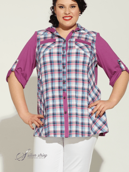 Блузон из 2-х комбинируемых тканей - клетки и однотонного трикотажа. Застежка на планку ( также из 2 частей) на пуговицы. Капюшон в клетку обтачен однотонным трикотажем. Полочка и пата на рукаве - в клетку по прямой. Спинка, регулируемые втачные рукава 3/4 с отворотом, листочки нагрудных карманов - из сиреневого трикотажа. Кармашки и подрезные бочка - по косой. Очень комфортная и спортивная вещь!
