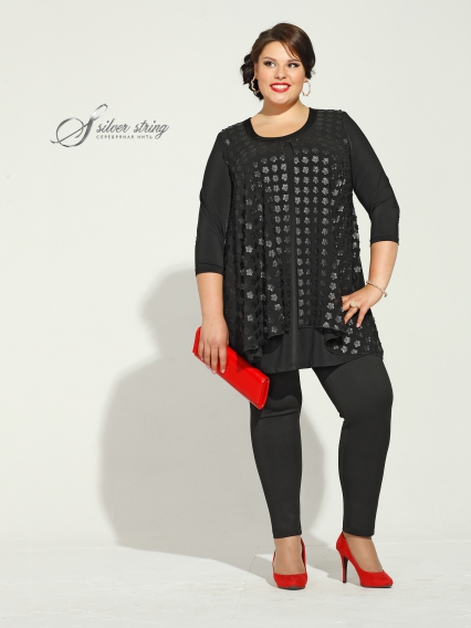 Оригинальная "блуза-обманка", имитирующая комплект, состоящий из нижней трикотажной блузы и шифоновой накидки без рукавов. Узкий, прямой рукав длиной 3/4