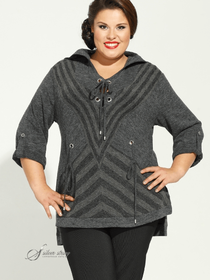 В трикотажном блузоне сочетаются два вида трикотажа: однотонный и в полоску. Большой воротник-матроска, крупные люверсы, разноуровневое оформление низа изделия, оригинальный крой- всё подчеркивает динамику модели. Шнур по линии талии и по горловине полочки позволит моделировать изделие по своему усмотрению.