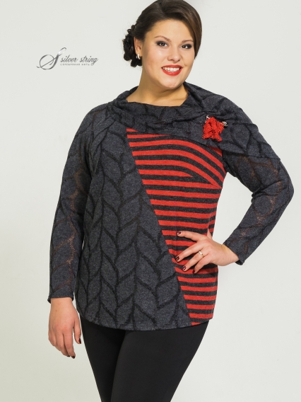 Нарядный трикотажный джемпер прилегающего силуэта, с длинным рукавом, выполнен из комбинированных трикотажных полотен. Большой воротник из ажурного трикотажа можно задрапировать по своему усмотрению и зафиксировать декоративной брошью.