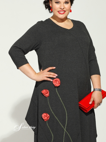 Очень симпатичное платье из вискозного эластичного трикотажа модного темно- серого цвета, полуприталеного силуэта. Рукав втачной 3/4 , У-образный вырез горловины, но особый шарм платью придает крой юбки - "ушки" в боковых швах и разноуровневый низ изделия с углами.