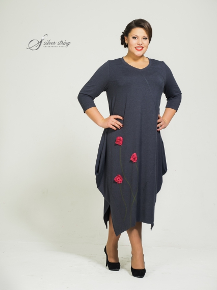 Очень симпатичное платье из вискозного эластичного трикотажа модного темно- серого цвета, полуприталеного силуэта. Рукав втачной 3/4 , У-образный вырез горловины, но особый шарм платью придает крой юбки - "ушки" в боковых швах и разноуровневый низ изделия с углами.