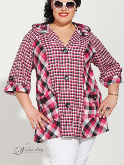 Летний комфортный свободный жакет спортивного стиля из хлопковой ткани. Крупная клетка великолепно сочетается в крое и по цвету с более мелкой. Капюшон, большие накладные карманы, паты на манжетах рукава и крупные контрастные пуговицы - все это создает динамичный образ современной женщины. Осталось подобрать брюки или капри - выбор цветовой гаммы и фасона остается за Вами! Рассмотрите нашу коллекцию.