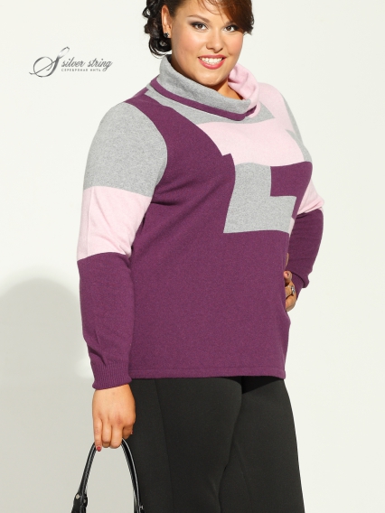 Модель спрямленного силуэта, с длинным рукавом и объёмным воротником-стойкой. Графический рисунок, из пряжи трех цветов, придает изделию динамичность.
