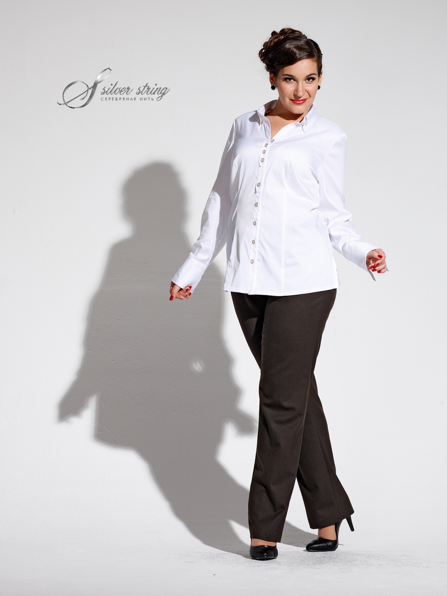 Современные классические брюки из эластичной ткани. Удобной посадке на фигуре способствует эластичная резиновая тесьма по задней части пояса брюк.