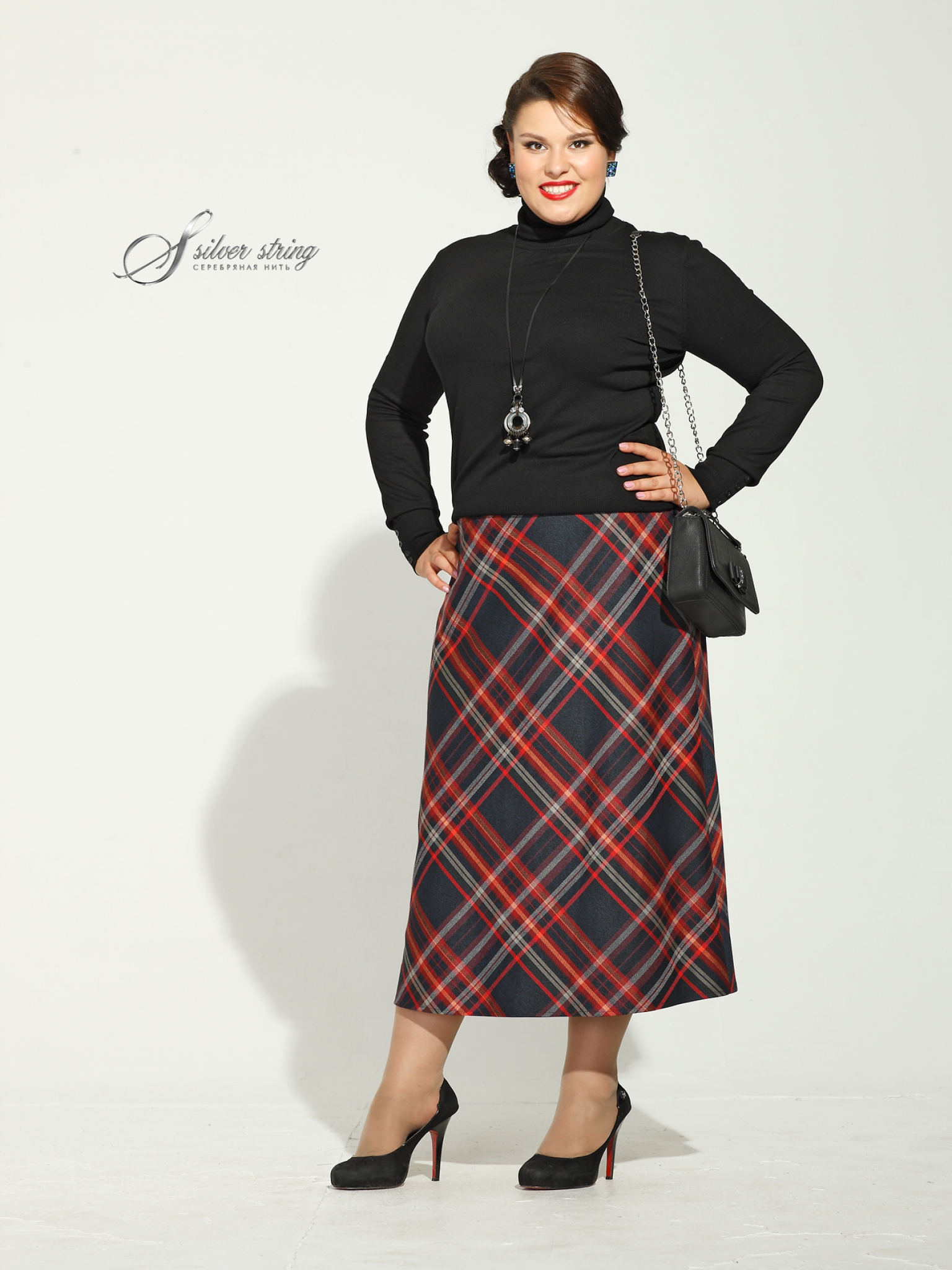 Юбка, слегка расклешенная к низу, длиной до середины икры, из теплой, мягкой полушерстяной ткани в крупную клетку, раскроенной по косой, на 100% вискозной подкладке. Спереди - пояс жесткий, по спинке - на резинке и фиксируется на талии пуговицей. Сзади на юбке проходит вертикальный шов, в который вставлена застежка-молния для идеальной посадки модели на фигуре.