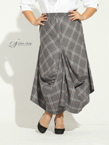 Оригинальная длинная юбка сложного кроя из модной в этом сезоне клетчатой ткани с большим содержанием вискозы и шерсти. Ткань теплая, мягкая, красиво драпирующаяся в фалды. Пояс на резинке. Застежка на молнию в боковом шве. По бедрам юбка не имеет большого объема, поэтому наши дамы останутся довольны - она не полнит!