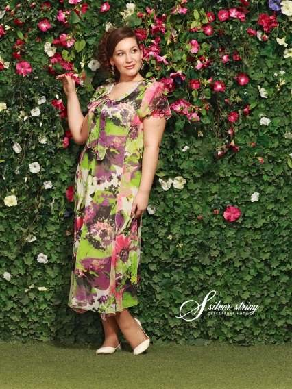 Шифоновое платье, укомплектовано нижним платьем-подкладкой, которое позволит скрыть все недочеты фигуры. Рельефы, стаченные на лицевую сторону, обработаны плотным "краевым" швом, что придает изделию графичность. Дополнительные клинья по низу платья добавляют кокетливости и легкости.