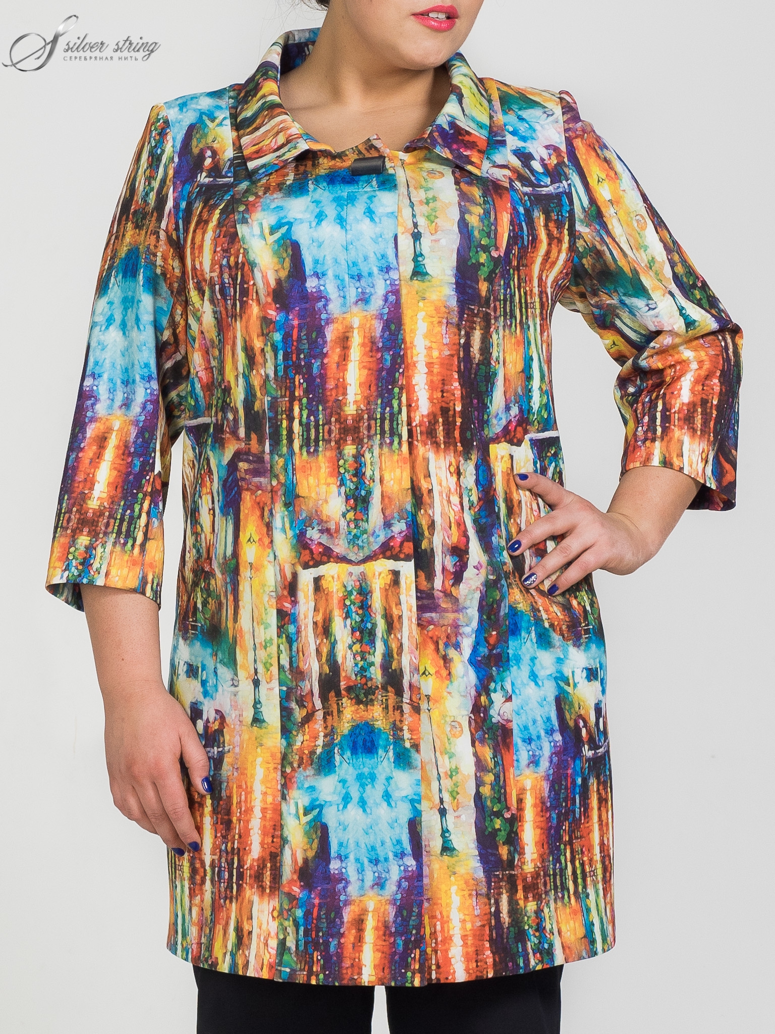 Летний плащ прямого силуэта из мягкого эластичного трикотажа. Рукав втачной, длиной 3/4. Горловина круглой формы, с супатной застежкой.
