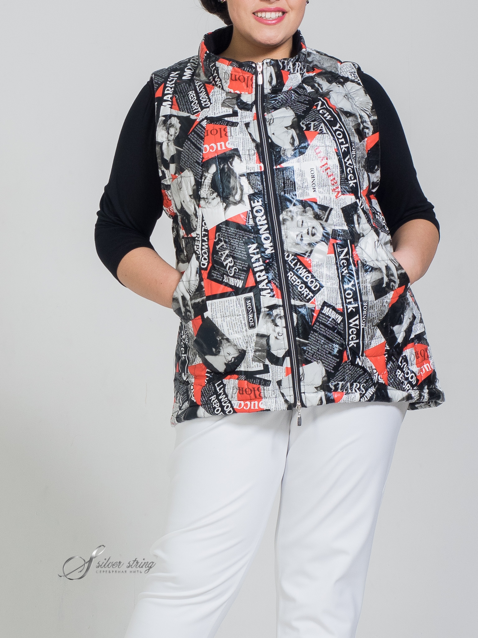 Утепленный, стеганый жилет. Воротник стойка. Застежка молния. Низ асимметричный : полочка короче, спинка длиннее. Карманы прорезные.