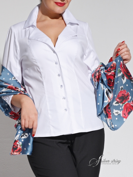 Блуза полуприлегающего силуэта с рукавом, длиной 3/4, выполнена из эластичной ткани. Английский воротник и четко оформленные отвороты по низу рукава, говорят об официально-деловом стиле изделия. Но дополнив модель ярким аксессуаром, Вы превратите её в нарядную.