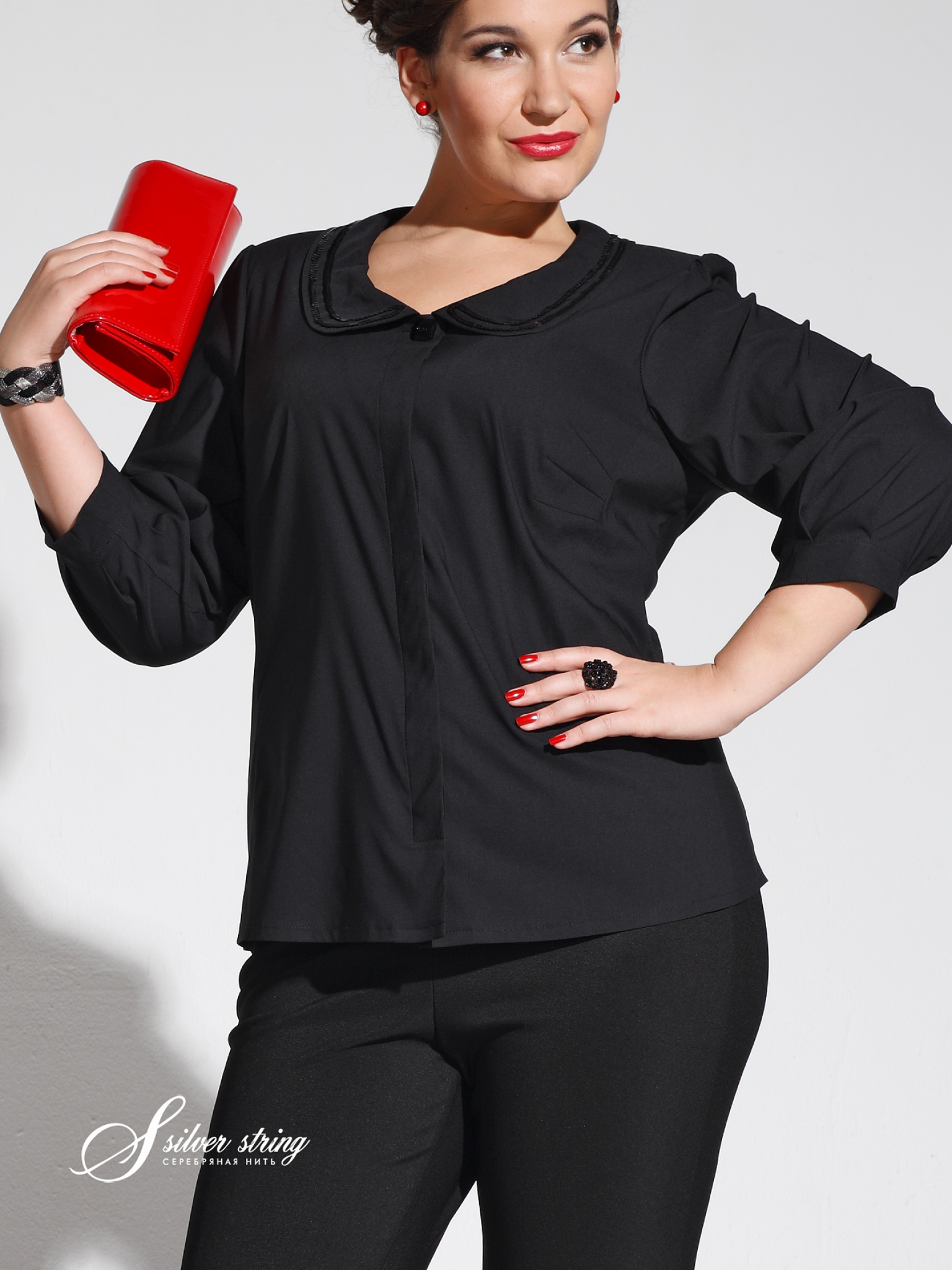Блузка прямая. Рукав 3/4, собранный по низу в складки . Горловина с круглым воротником, который обработан отделочной тесьмой. Застеж-ка -супата.