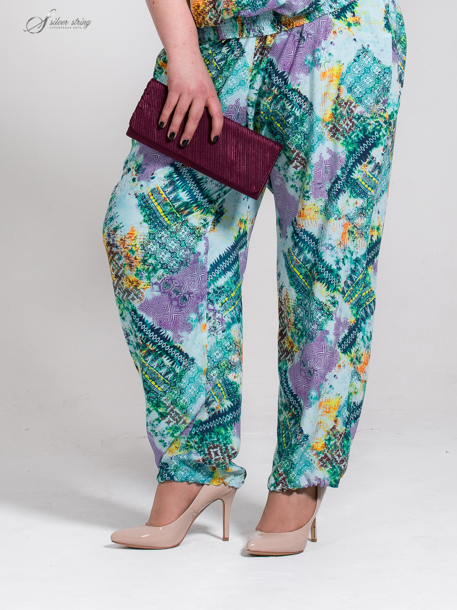 Брюки летние, типа "шаровары" на резинке по линии талии , из легкой , приятной ткани. Состав ткани ( хлопок и вискоза) позволяет очень комфортно чувствовать себя в летнюю жару. Брюки чуть заужены и собираются на кулиску внизу изделия. В нашей коллекции к ним имеется замечательная пара - блузка из такой же ткани.