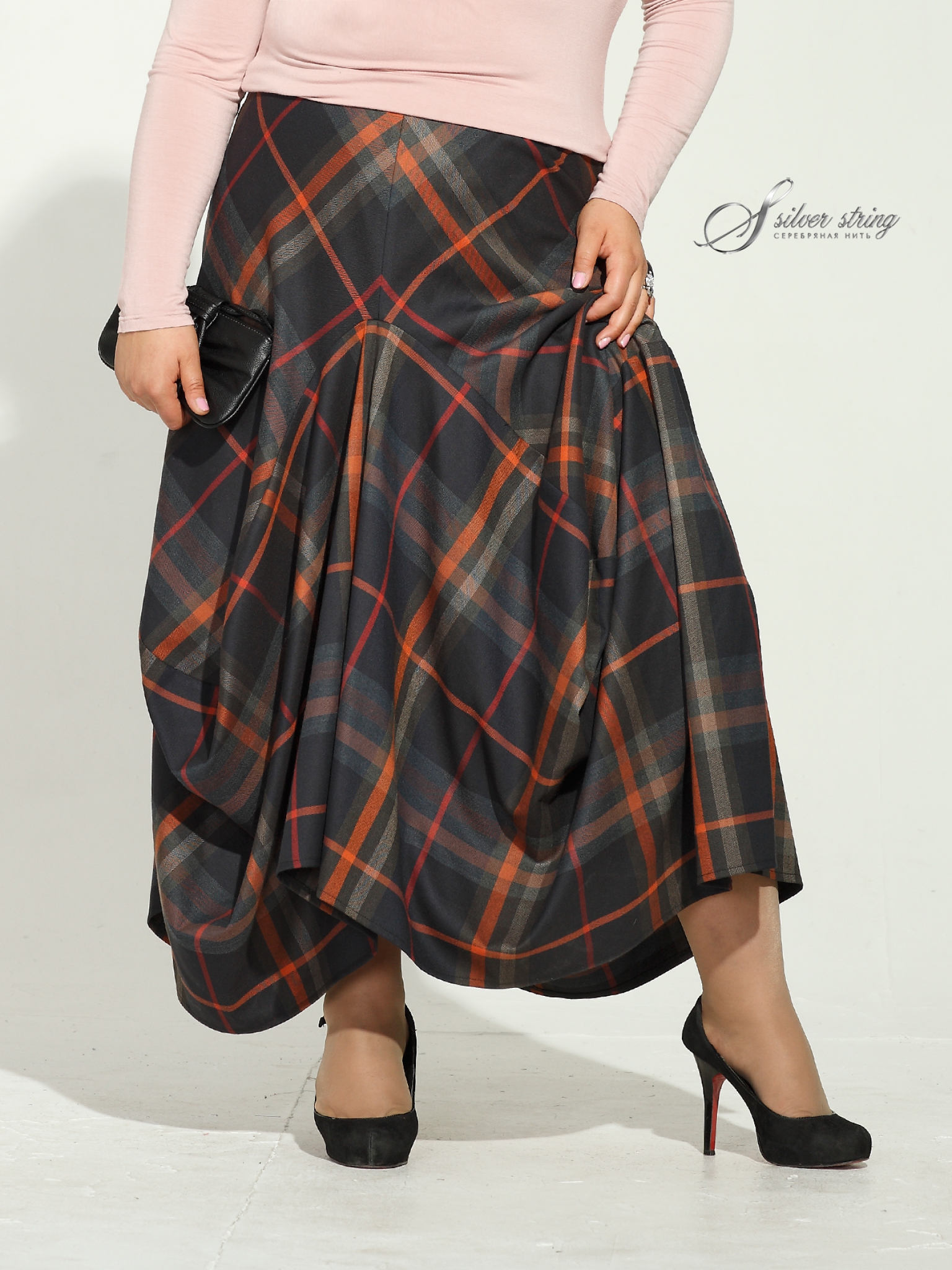 Юбка длинная, свободная, широкая. Сложная, интересная по крою. Ткань мягкая, хорошо драпируется, красиво ложатся многочисленные складки. Рисунок ткани геометрический - клетка.