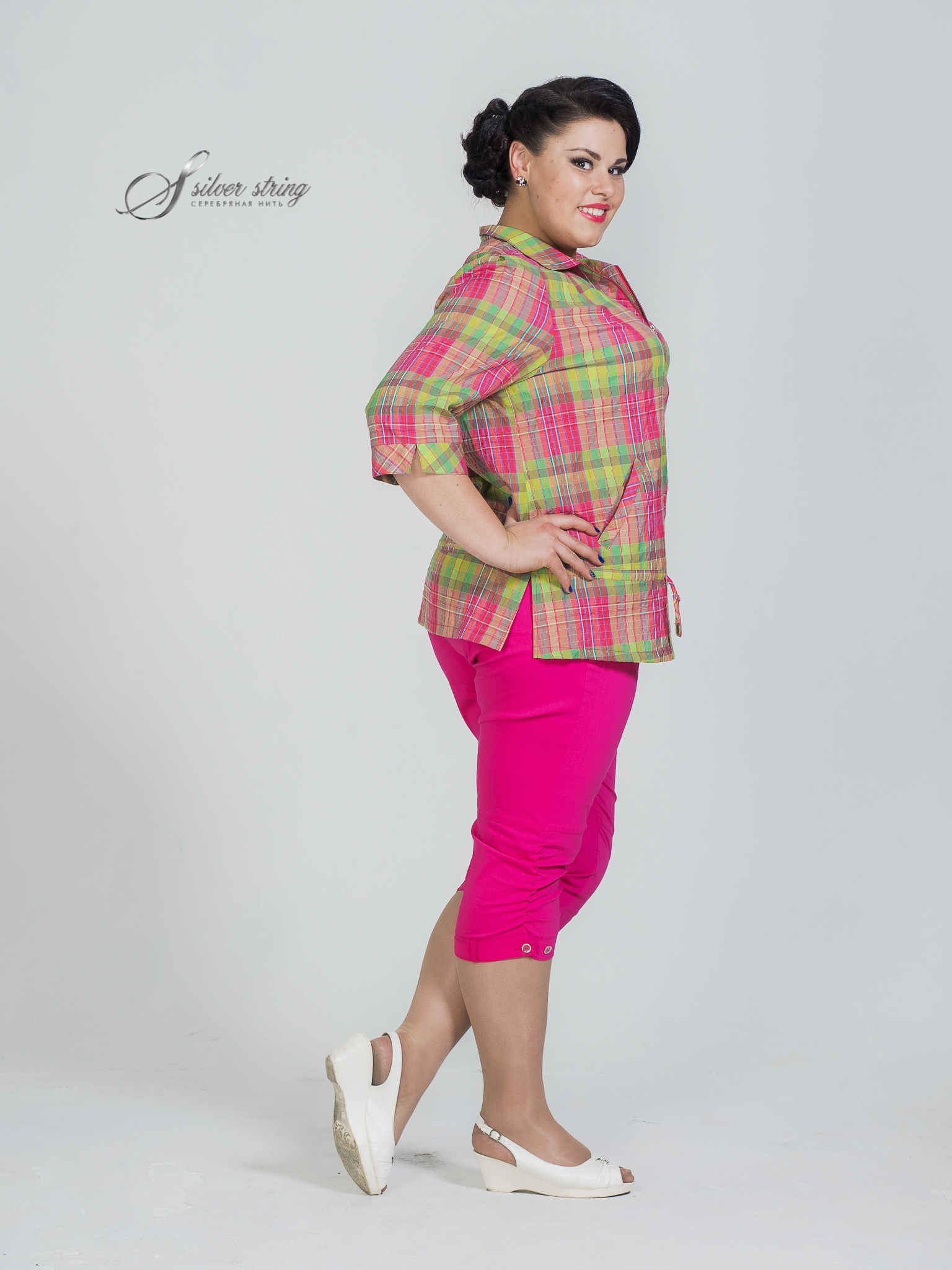 Прямая блузка. Спортивный воротник. Планка притачная, фиксируется молнией. Рукав 3/4. Манжет отрезной с разрезом. По плечам кокетки. По линии бедер проходят кулиски. Ткань натуральная, рисунок - клетка.
