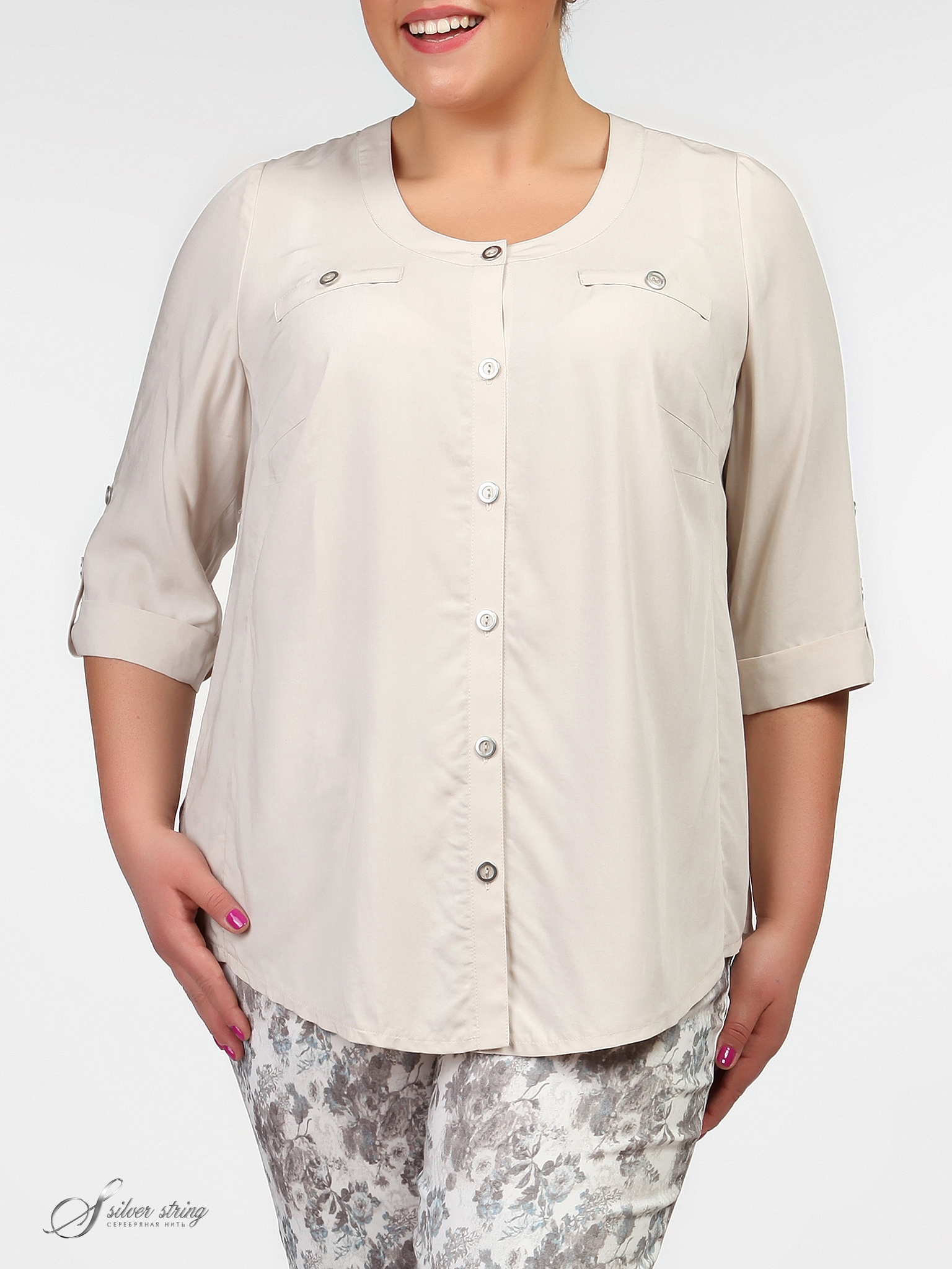 Свободная блуза прямого силуэта, с фигурной планкой по линии горловины. Рукав с отворотом длиной 3/4, регулируется по длине в двух положениях патой и пуговицами.