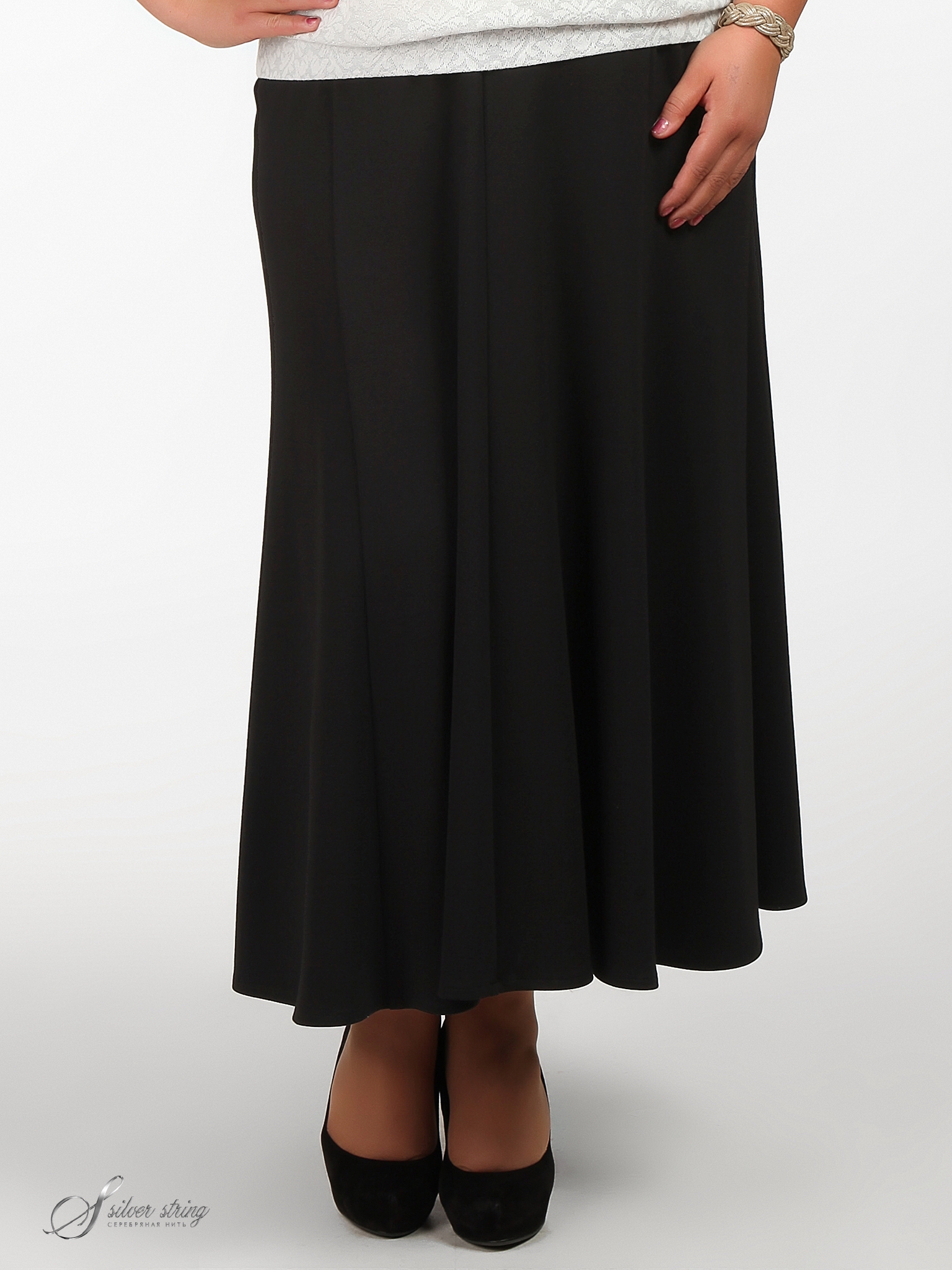 Юбка покроя "годе" из эластичного "джерси". Вместо пояса по верхнему контуру проложена эластичная тесьма.