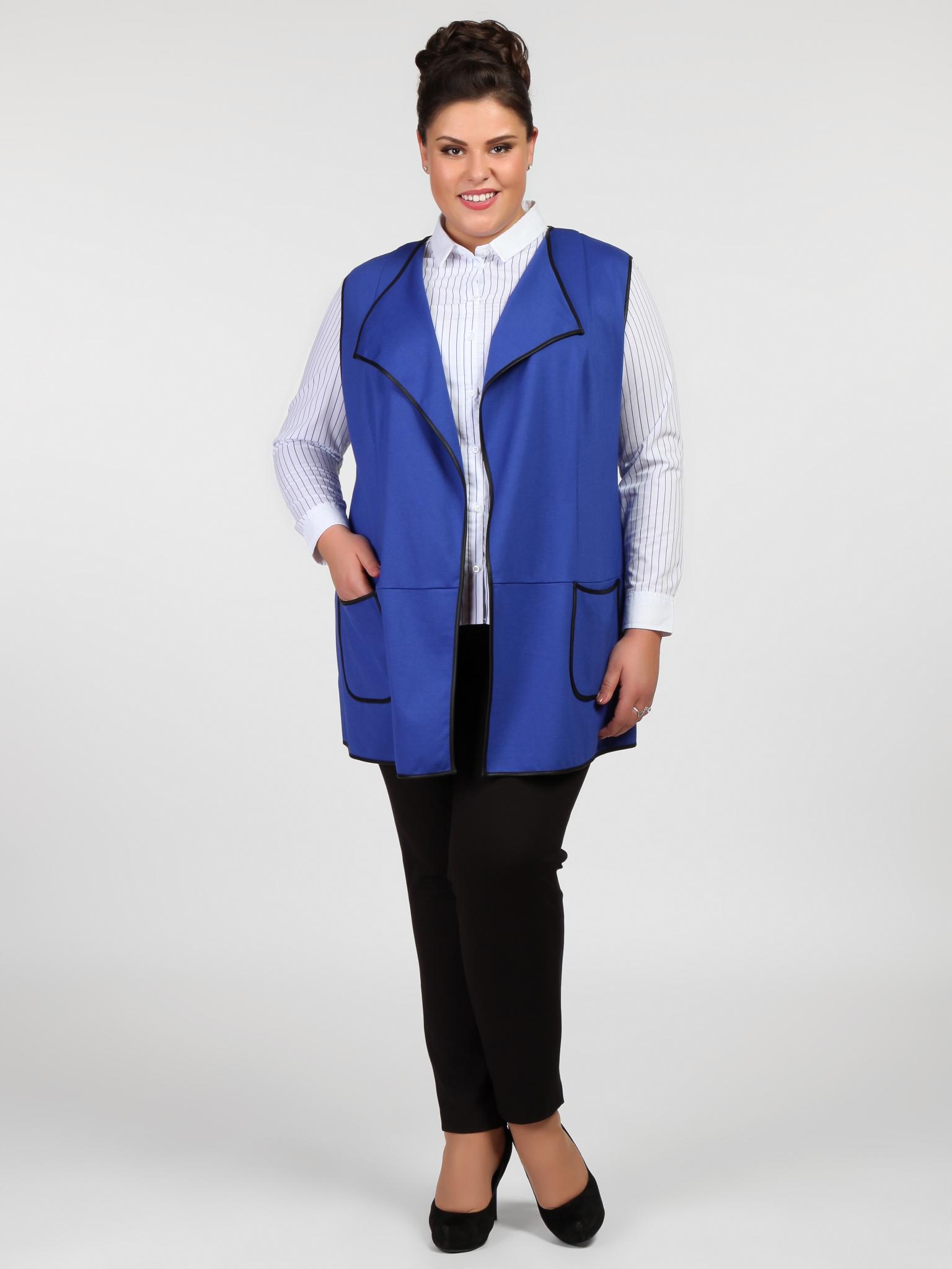 Прямой, удлиненный жилет свободной формы. Воротник - Жилет без застежки. лацкан мягкой формы. Карманы на строчные. Открытые срезы обработаны эко-кожей.
