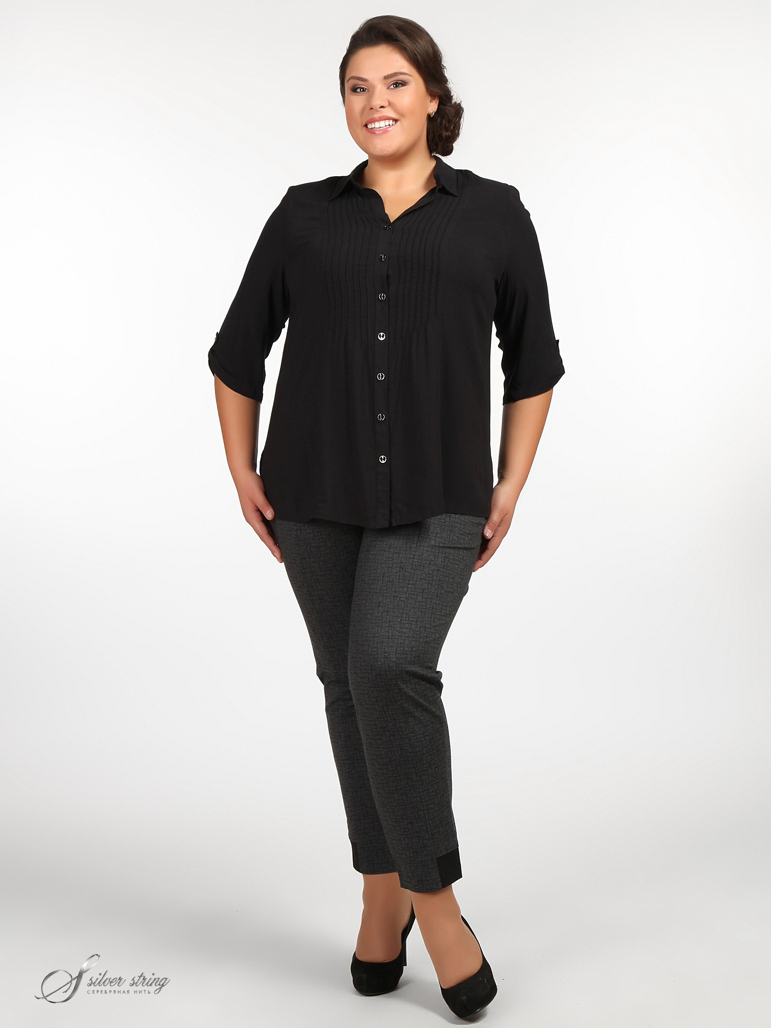 Блузка прямого силуэта. Рукав вачной, длина 3/4, низ рукава подхвачен патой. Воротник рубашечный. Застежка планка на пуговицы петли. По полочке проложены декоративный защипы.