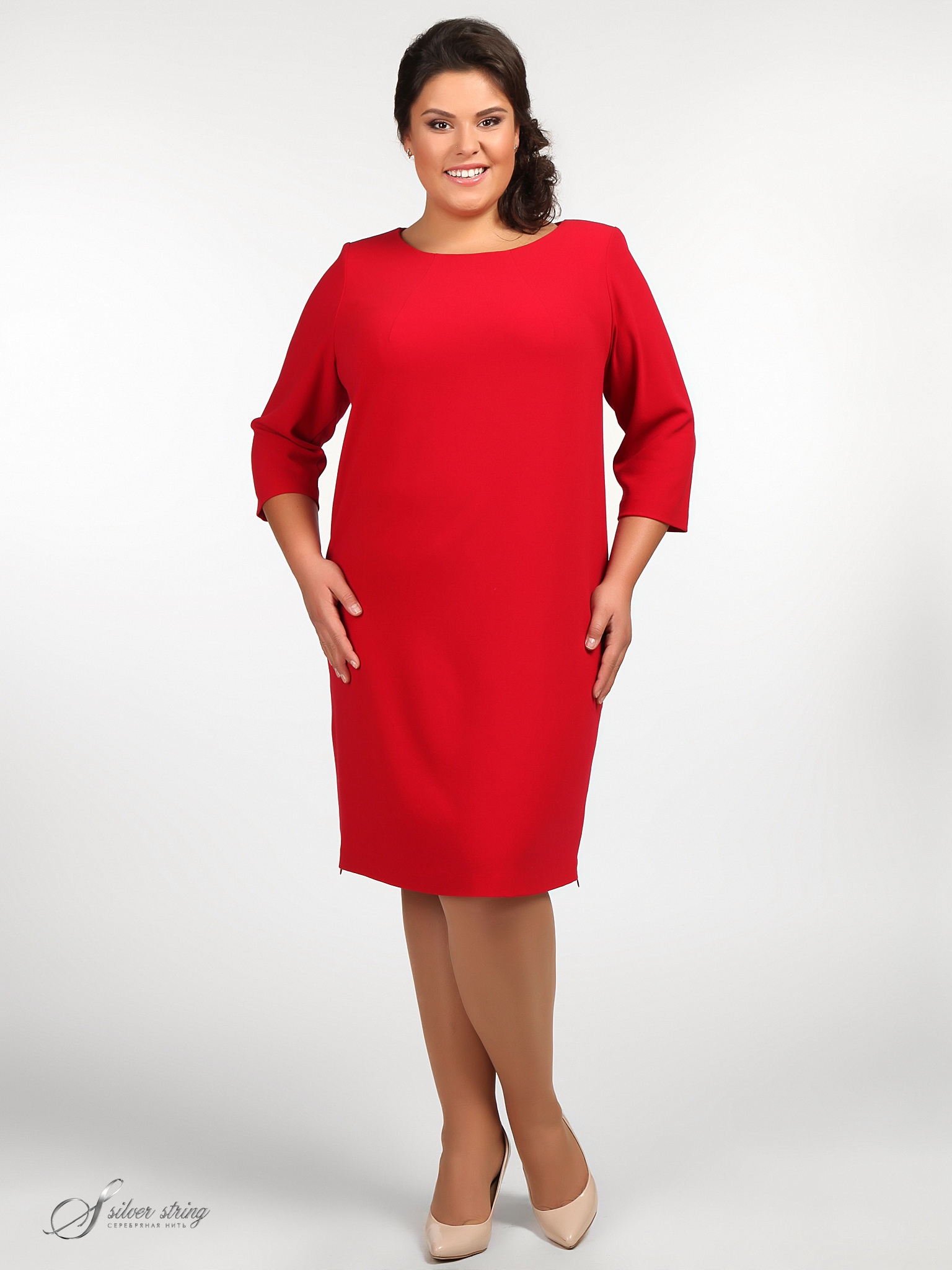 Элегантное платье с рукавом длиной 3/4 и скругленной линией горловины. По среднему шву спинки проходит застежка-молния. По низу модели, боковых швах, вставлены потайные молнии, с помощью которых можно сформировать разрезы желаемой высоты.