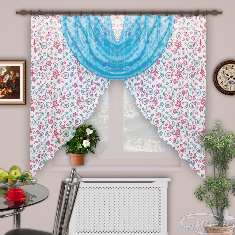 Нежная и воздушная шторка для кухонного окна. По центру акцентом модели является лёгкая качелька"парус". Ширина 4,0 метра даёт хорошую драпировку на карнизе от 1,5 до 2,5 метров.