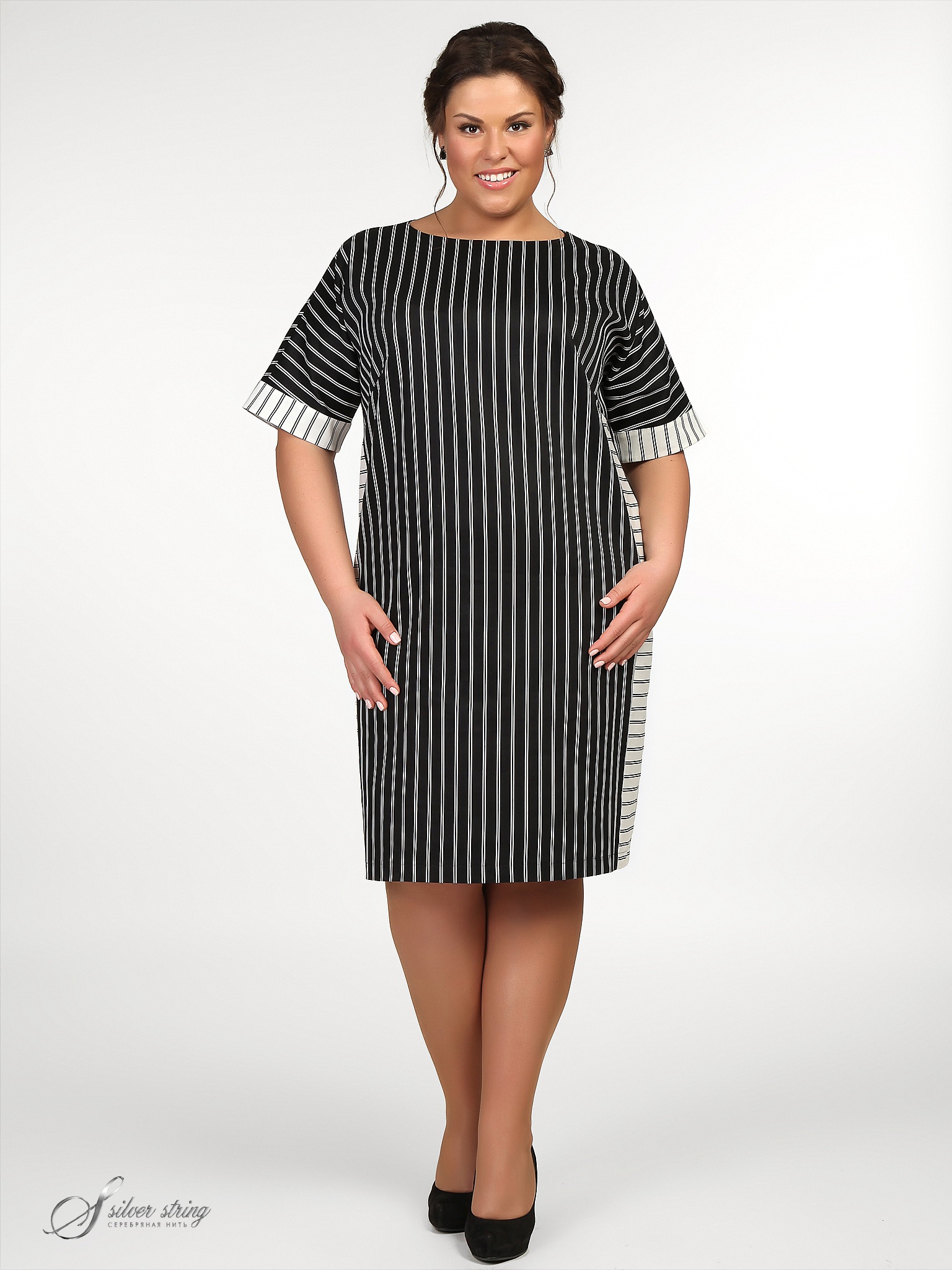 Летнее платье прямого силуэта. Горловина форма "лодочка". Рукав цельнокроеный, длина рукава короткая. По спинке проходит вертикальный подрез в котором обработана шлица. По полочку два подреза из проймы, из которых выходят вытачки. В модели используется два дизайна ткани. Ткань плательная с высоким содержанием хлопка. Длина изделия до колен.