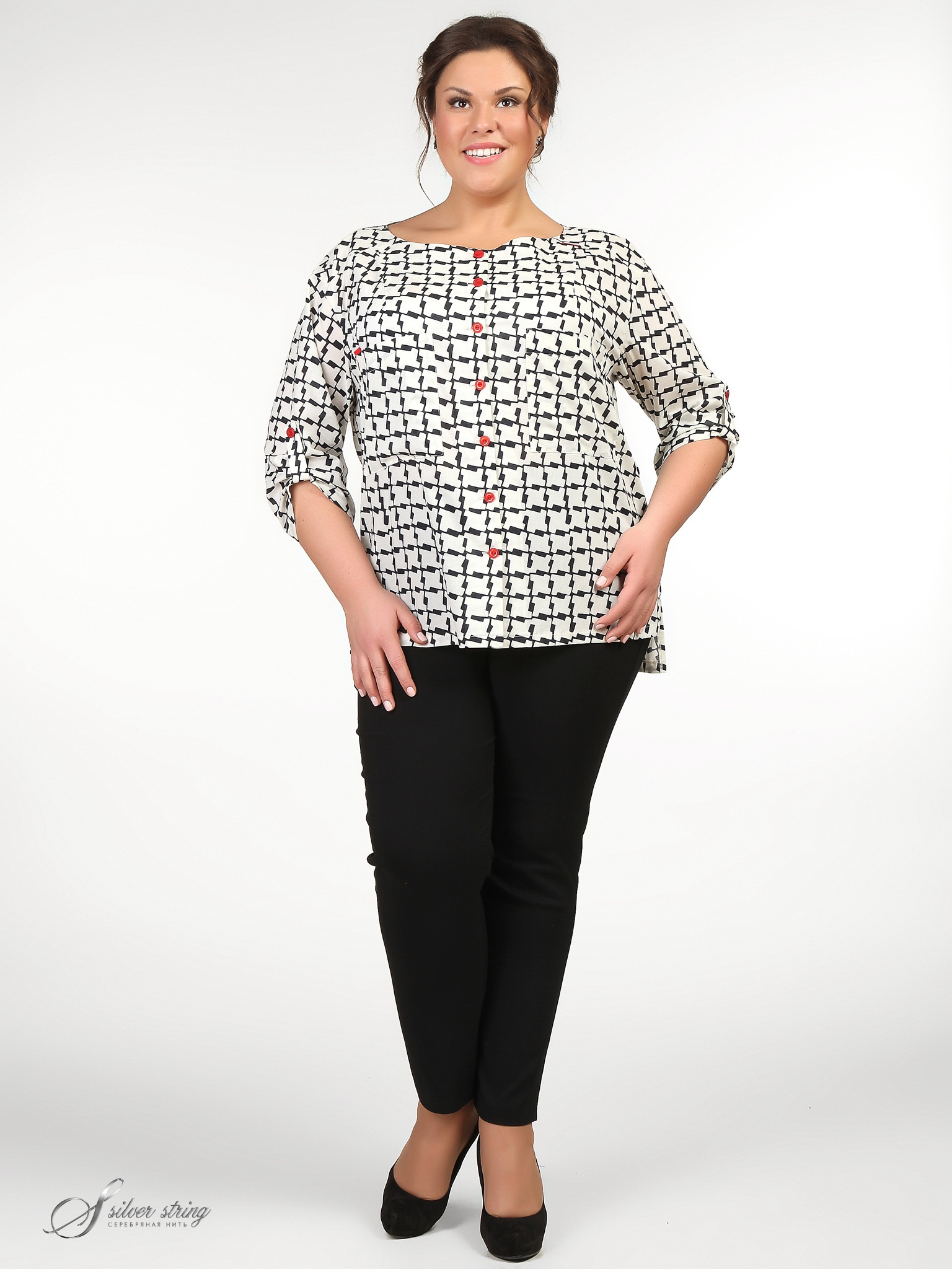 Блуза Т-образного силуэта с рукавом, длиной 3/4. Полочка и спинка модели имеют разную длину, в боковых швах обработаны разрезы. Изделие выполнено из легкой ткани с высоким содержанием хлопка. Крупные накладные карманы и вырез горловины "лодочкой" делают модель современной.